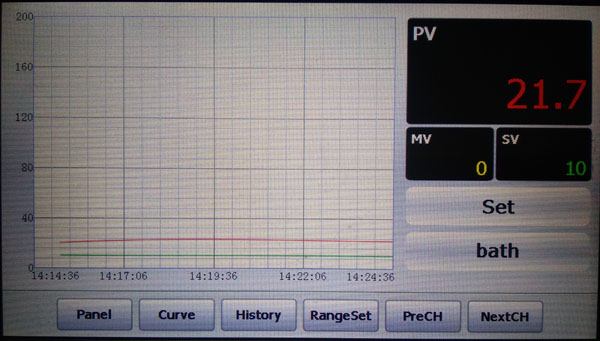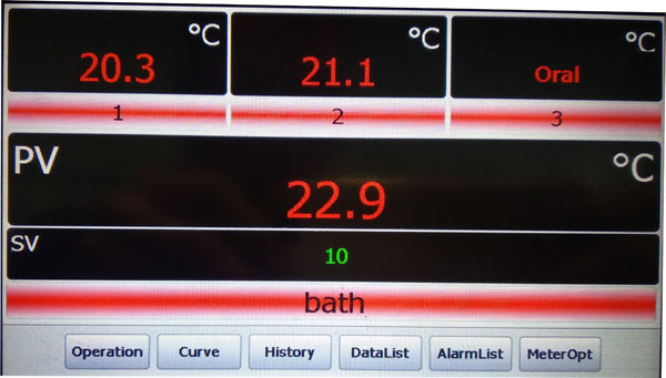 1、2、3分別是試管內(nèi)傳感器測量溫度,當(dāng)某個(gè)通道傳感器故障會(huì)提示“Oral”,PV為槽內(nèi)測量溫度,SV為設(shè)定溫度,點(diǎn)擊“bath”欄后可設(shè)定現(xiàn)場參數(shù):